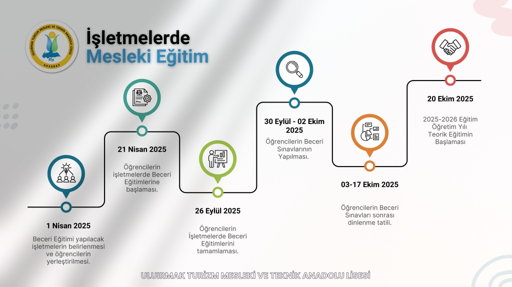 2025-2026 eğitim-öğretim yılı, 21 Nisan 2025 – 26 Eylül 2025 tarihleri arası Okulumuz, Konaklama ve Seyahat Hizmetleri ile Yiyecek İçecek Hizmetleri Alanında okuyan 11 ve 12. sınıf öğrencilerinin İşletmelerde Mesleki Eğitim çalışmaları tamamlandı.