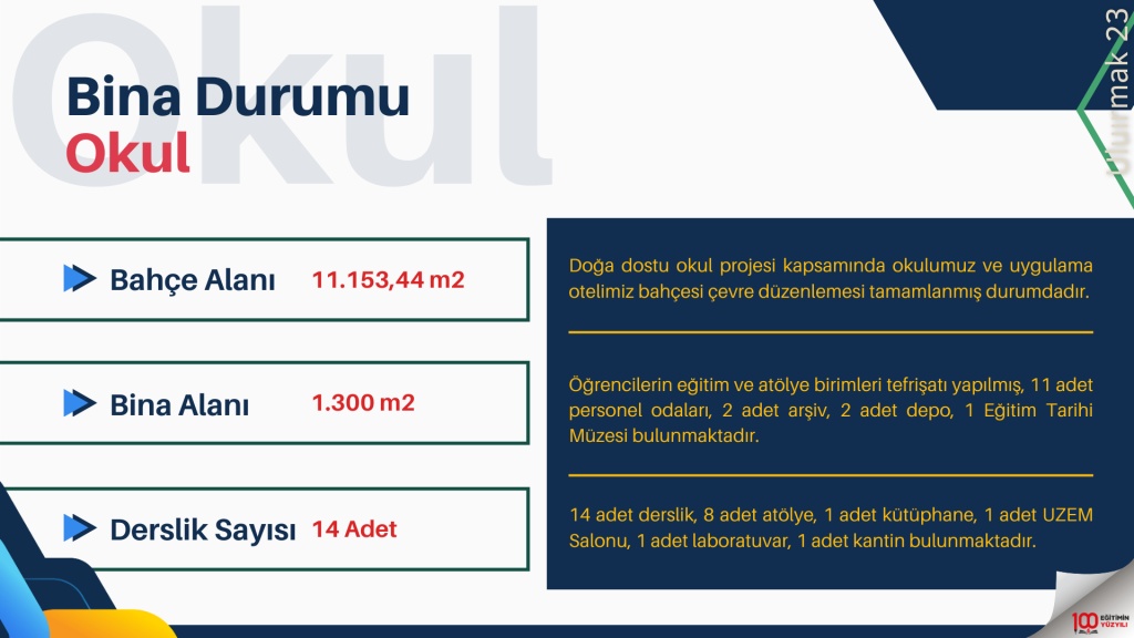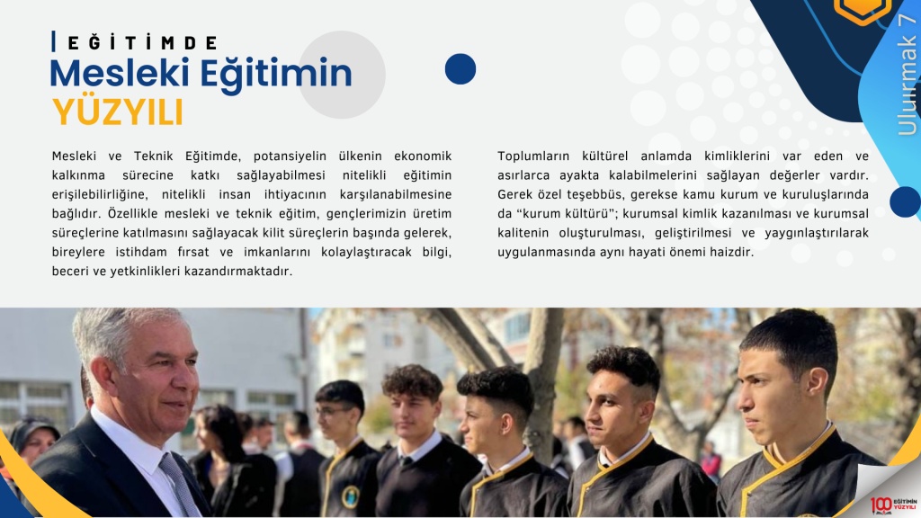 Mesleki ve teknik ortaöğretim kurumlarında; genel ortaöğretim kurumlarının amaçlarının yanı sıra sanayi, ticaret, turizm, tarım, sağlık, teknoloji ve benzeri alanlarda ulusal ve uluslararası standartlar ve sınıflamalara, ulusal yeterliklere ve mevzuata dayalı olarak nitelikli işgücünün yetiştirilmesi, mesleki bilgi ve becerilerin güncellenmesi, uygulanan programlarla girişimcilik, meslek ahlâkı, ahilik bilinci ve özgüveni yüksek, kendini doğru ifade edebilen, sosyal, estetik algısı gelişmiş, sosyal ve çevresel sorumluluk bilinci ile iş alışkanlığı kazanmış, istihdama hazır, önceki öğrenmelerini ve denkliği tanınmış mesleki ve teknik eğitime ilişkin tüm belgeleriyle hayata, istihdama ve yükseköğretime hazır bireylerin yetiştirilmesi için çalışıyoruz.