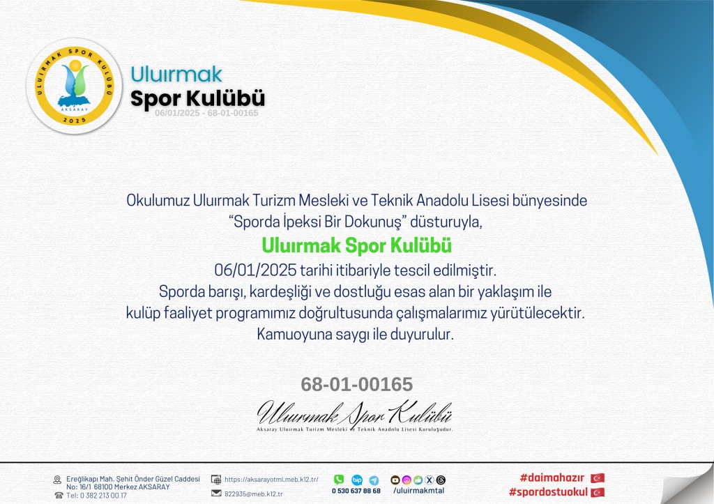 Uluırmak Spor Kulübü, 06/01/2025 tarihinde Uluırmak Mesleki ve Teknik Anadolu Lisesi bünyesinde kurulmuştur